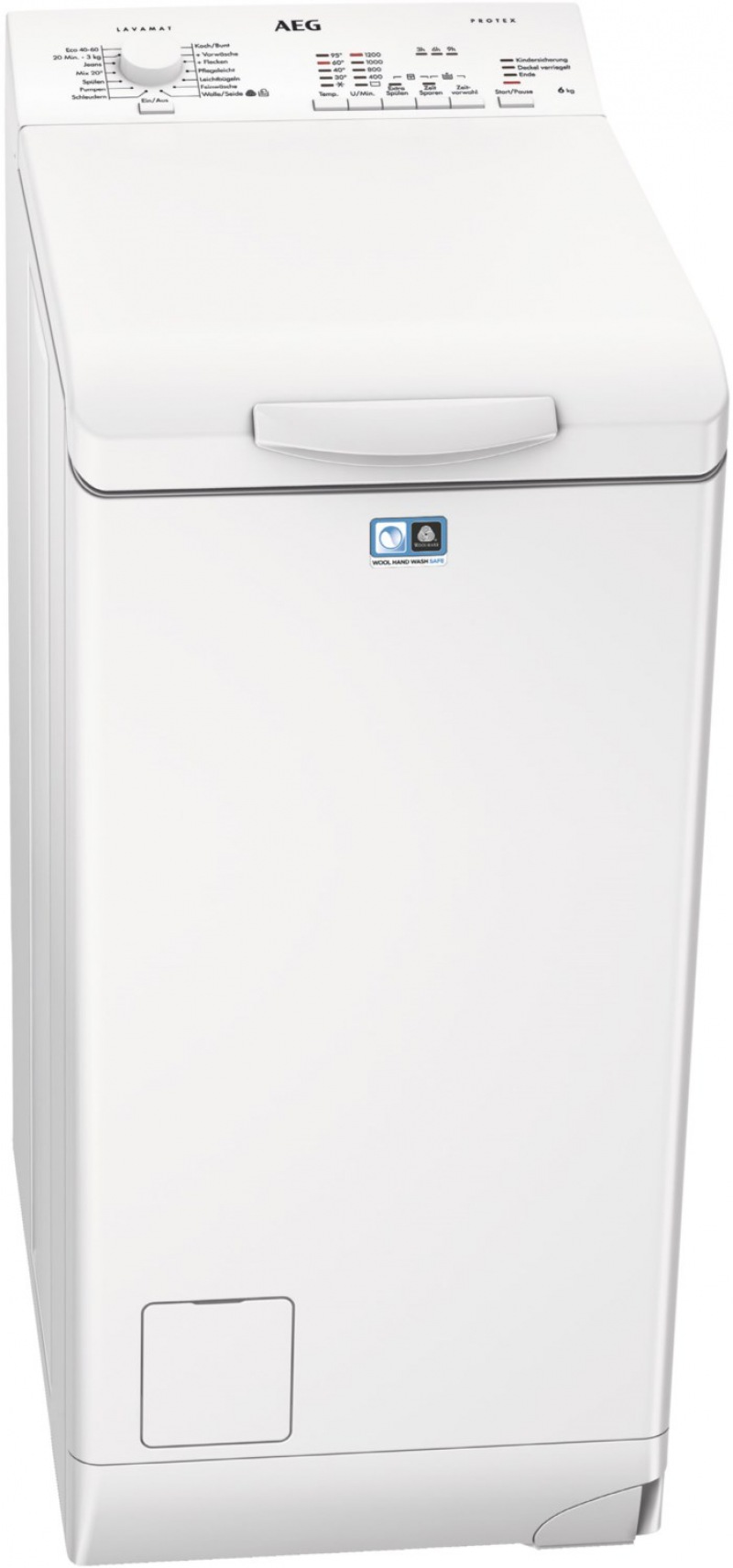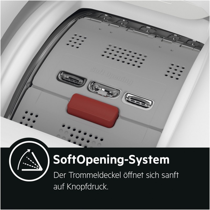 Ezen a felültöltős mosógépen gondosan megtervezett könnyen nyíló mosódob ajtó van, hogy mindig biztonságosan – és akár egy kézzel – be tudjon nyúlni a mosódob belsejébe.